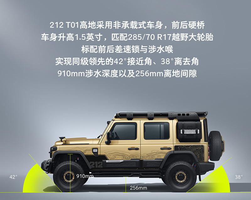 外观方面,新车在现款的基础上增加了专属越野套件。前脸依旧是采用三条杠中网搭配圆形大灯组,另外还增加了防爆网灯罩。前后包围重新设计,更为越野。另外还提供涉水喉、加宽侧踏板、换装瞄准镜式门把手等。新车还提供晨曦金配色及车身拉花。车身尺寸方面,新车长宽高分别为4811*1945*1999mm,轴距2860mm,车身升高1.5英寸。