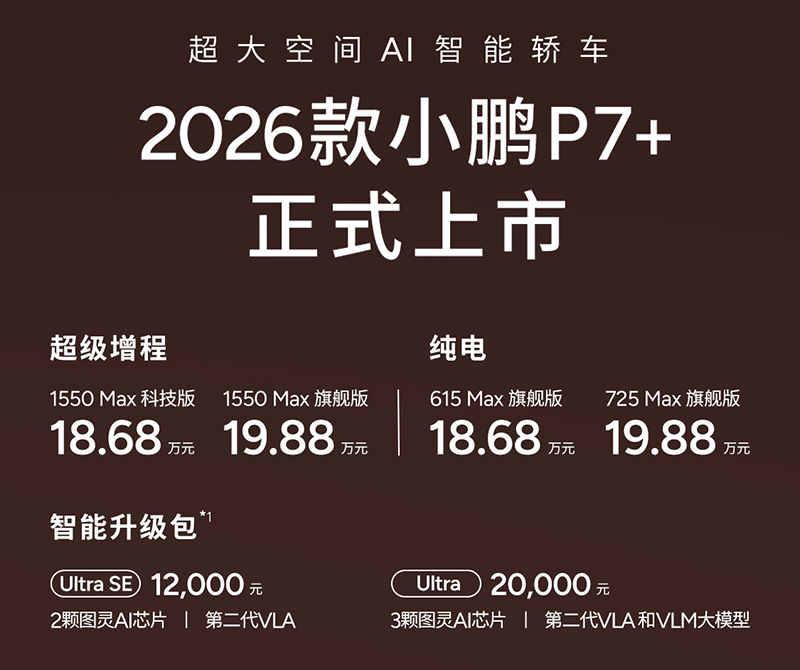 1月8日,2026款小鹏P7+上市,共推出4款车型,售价区间为18.68-19.88万。