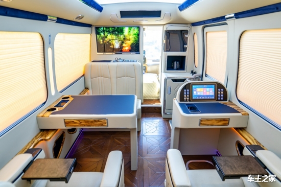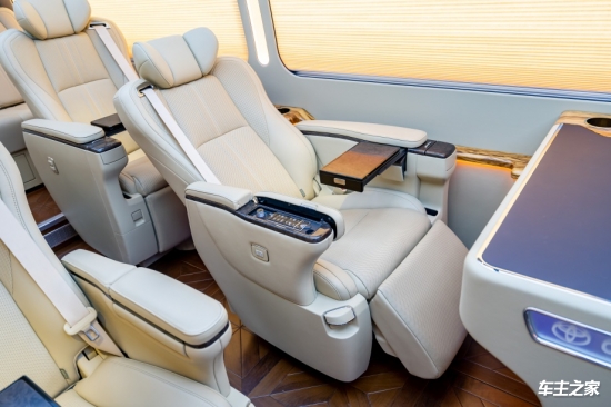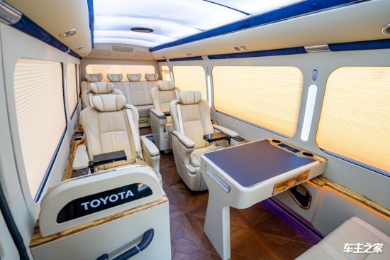 考斯特 12 座车型经精心改装后,完美融合了奢华与实用,尤其是车内配备的四张埃尔法座椅,搭配梧桐木地板、隐藏鞋柜与茶台,让出行成为一种极致享受。