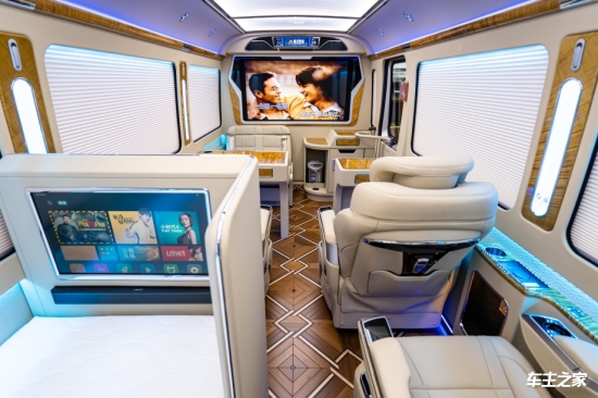 宽大的座椅造型搭配顶级真皮材质,触感细腻柔软,透气性极佳;电动调节功能涵盖靠背倾斜、座椅前后滑动、腿托升降等多个维度,配合加热、通风与按摩功能,无论是严寒酷暑,还是长途奔波,都能为乘客带来头等舱般的尊享体验,让每一次出行都成为身心的极致享受。升降电视全隔断与长条形广告屏的组合,将车内空间的功能性与智能性推向新高度。一键操作,电视缓缓升起,全隔断玻璃同步雾化,将车厢瞬间分隔成独立私密的空间。