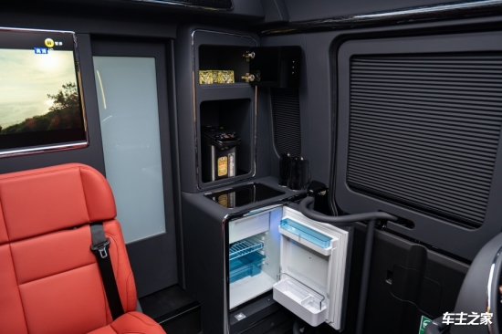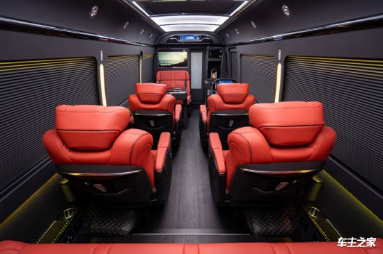 电动侧滑玻璃配备双层隔音夹层,一键调节开度,兼顾通风与降噪需求。车顶搭载空客A380同款铝合金骨架顶灯,支持三级明暗调节,可随场景切换暖光或冷光模式。后舱语音控制系统可操控空调、窗帘与娱乐设备,JBL套装喇叭与10寸重低音炮构建7.1声道环绕声场,搭配4K高清吸顶电视,打造沉浸式影音体验。此外,正玄波逆变器与全车电路升级,可支持多设备同时运行,满足移动办公需求。
