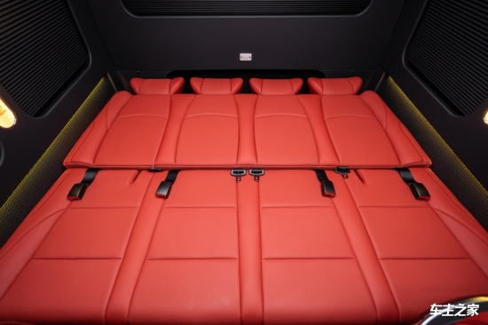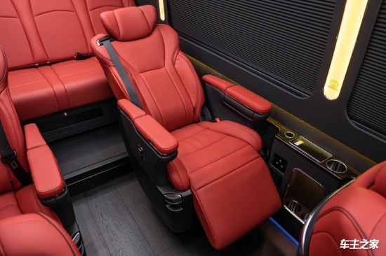 第二排配备两张新款旗舰航空座椅,采用进口Nappa真皮包裹,支持16向电动调节、通风/加热及10种按摩模式,零重力模式下可后仰至128°,分散脊椎压力,长途疲劳感降低70%。座椅扶手集成触控屏,可独立调节空调与座椅状态,末端杯架带制冷功能,兼顾实用与格调。紧邻的两张豪华座椅搭载8向调节与通风功能,高密度记忆棉座垫提供柔软支撑,满足随行人员的舒适需求。