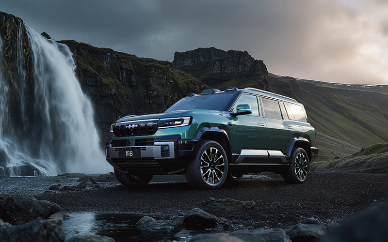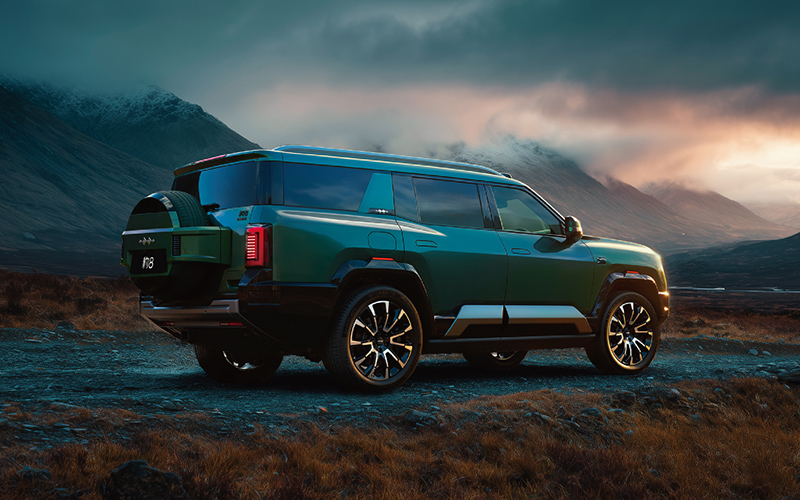 外观方面,新车延续现款造型,采用方盒子造型,黑化中网搭配星舰飞翼大灯,前机舱盖两侧隆起彰显力量感。在车顶还有激光雷达的装置。在车尾还配有外露式备胎,提供智驾小蓝灯。新车增加了湖光绿车身配色。车身尺寸方面,新车长宽高分别为5195*1994*1875(1905)mm,轴距2920mm。
