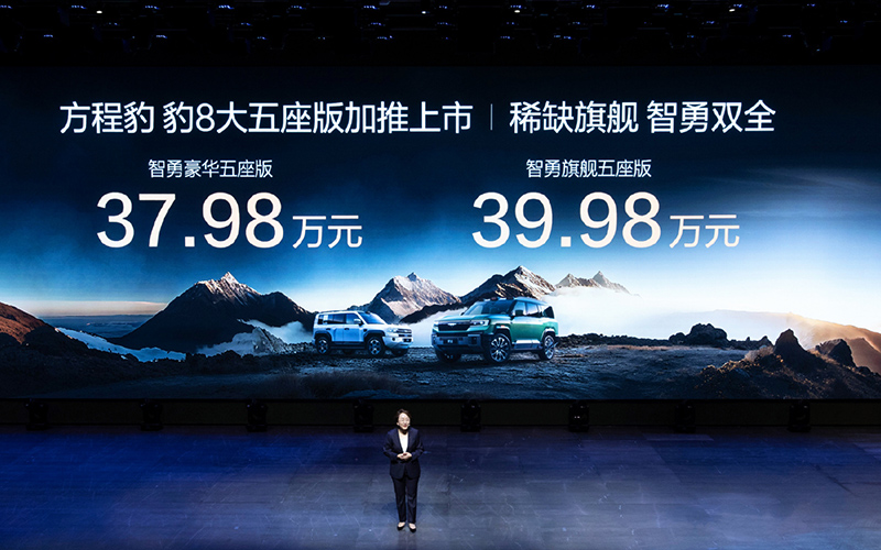 近日,方程豹豹8大五座版上市,共推出2款车型,售价区间为37.98-39.98万。