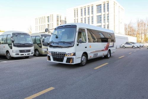 15 座考斯特米黄金埃尔法样式版延续考斯特系列经典车身轮廓,同时融入埃尔法车型的设计元素,传递出 “低调奢华” 的商务气质。车身选用 “曜石黑” 金属漆,经过 “电泳 中涂 色漆 清漆” 五重精密喷涂工艺,漆面厚度达 145μm,抗刮擦性能与耐候性远超行业标准,长期使用后仍能保持如同镜面般的细腻光泽,深邃的黑色车身搭配细节处的镀铬装饰,既契合高端商务场景的沉稳定位,又在视觉上彰显尊贵感。