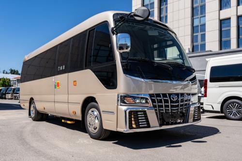 侧面细节:20 英寸多幅式亮面镀铬轮毂,边缘点缀银色烤漆饰条,兼顾奢华感与耐用性;双侧电动侧滑门开启宽度达 100cm,配合带 “COASTER” 标识的冷光迎宾踏板(暖白色光带),乘客上下车便捷且具仪式感;