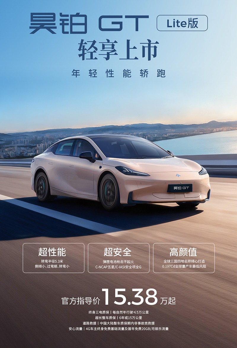 今日,广汽昊铂GT Lite版正式上市,共推出2款车型,售价区间为15.38-15.88万。