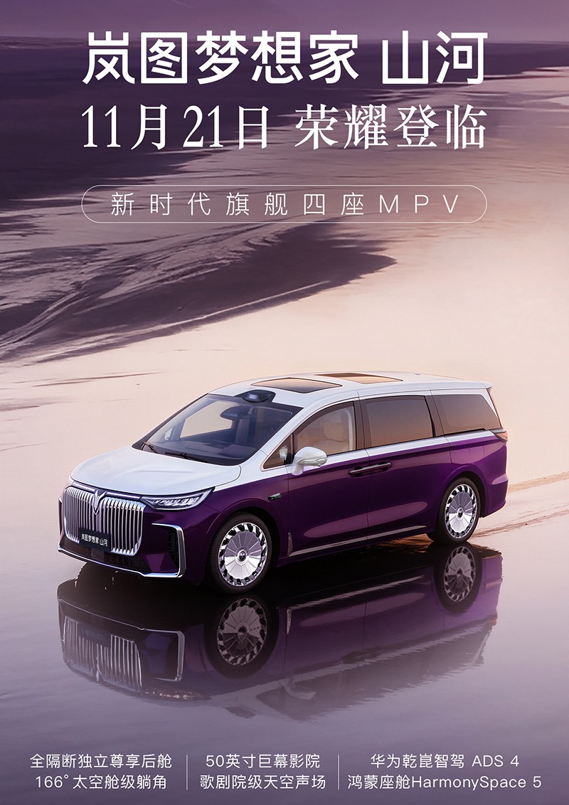 官方公布,岚图梦想家山河版将11月21日上市。此前2026款梦想家已经上市,售价为32.99-43.99万。