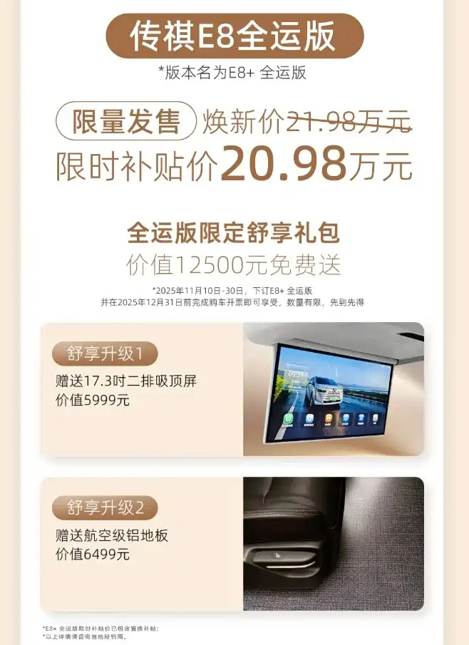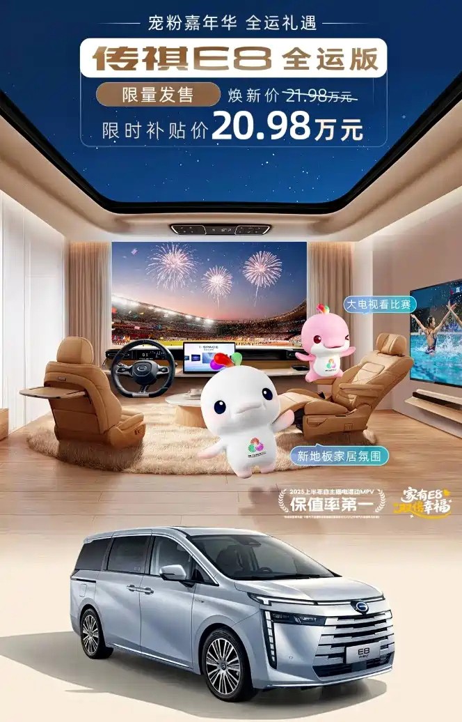 近日,广汽传祺E8全运版上市,限时补贴价20.98万。
