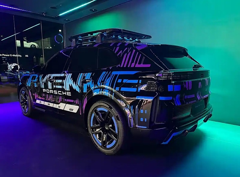 车身侧面,新车整体圆润动感,采用传统的门把手样式,轮圈风格也与保时捷纯电家族的车型保持一致。车辆尾部,尾灯采用贯穿式设计,全新的格子状尾灯样式相当别致,尾部两侧设计有导流槽,后包围同样相当动感。