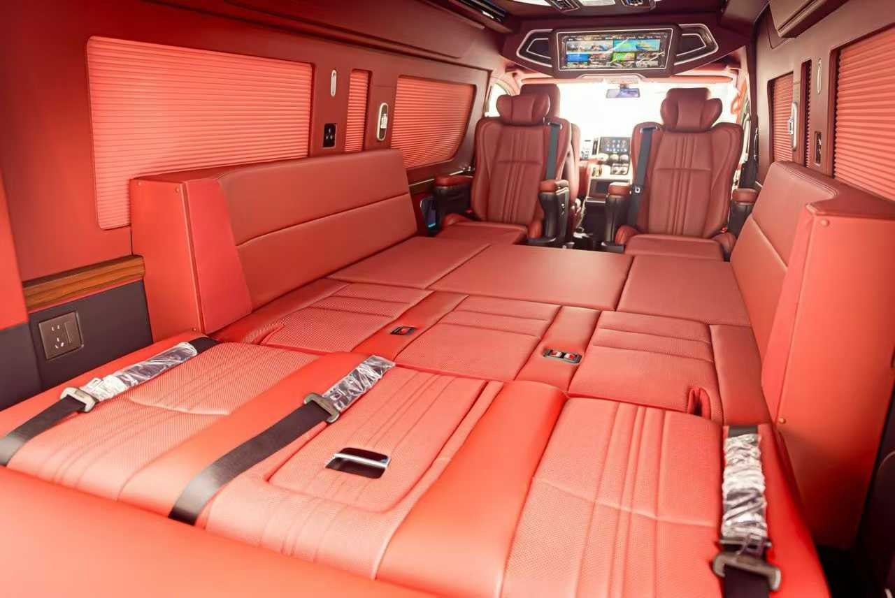 前排的航空按摩座椅都可180度旋转,和后面的沙发床连接起来大人也能躺平了睡一觉。