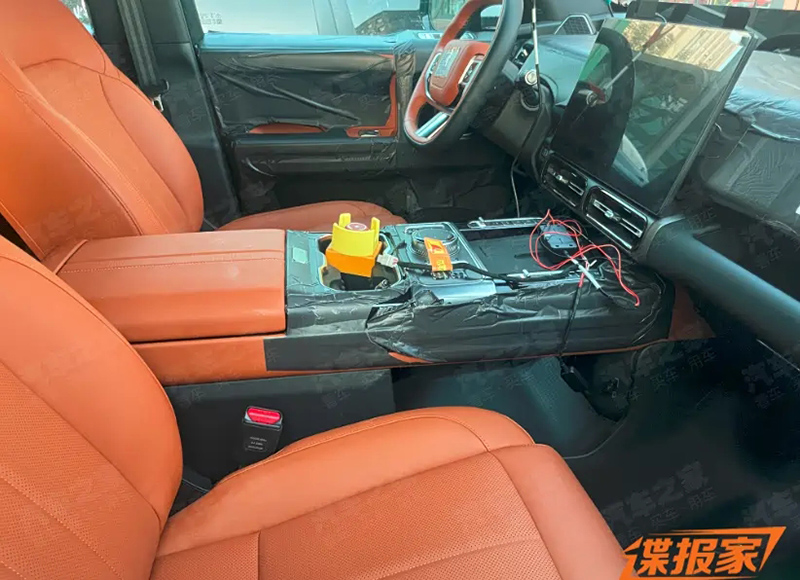内饰方面,根据此前的谍照来看,新车整体延续纵横G700的内饰风格。前排整体采用了方正为主的设计增添硬派质感,另外它还会配备15.6英寸悬浮式中控屏和35.4英寸贯穿式显示屏(天际屏)等提升科技感。