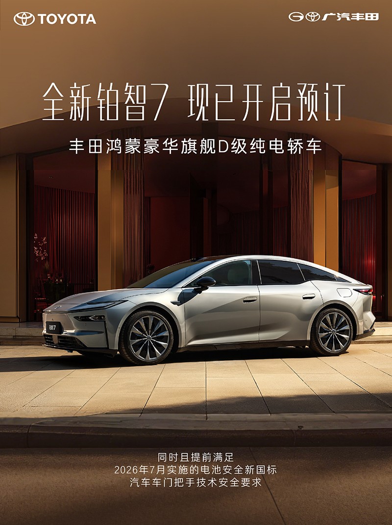 广汽丰田铂智7正式开启盲订,官方公布,在2025年12月31日前预订的用户因2026年购置税政策变化产生的额外支出将由厂家承担。新车定位大型旗舰纯电轿车,定价在20万级别,结合此前消息,将2026年3月上市。