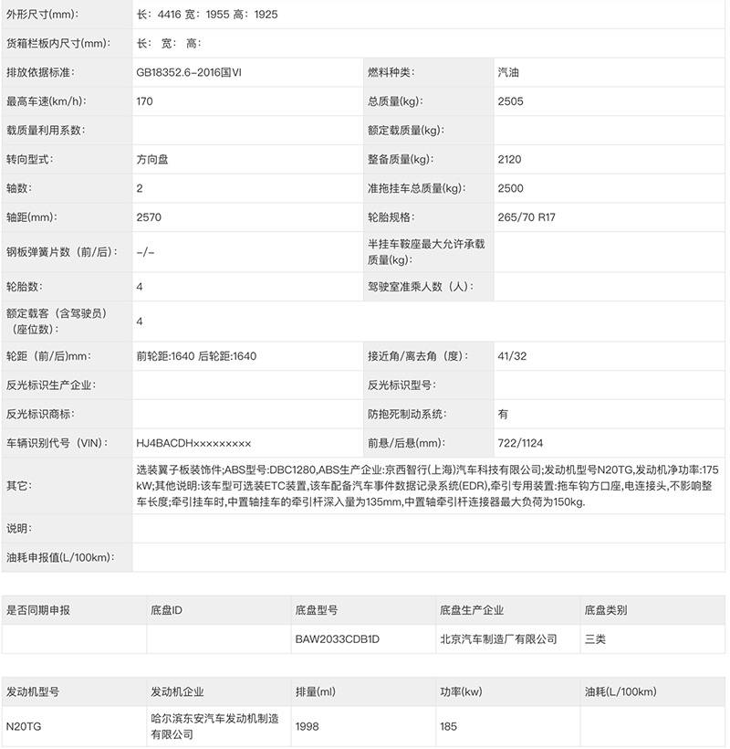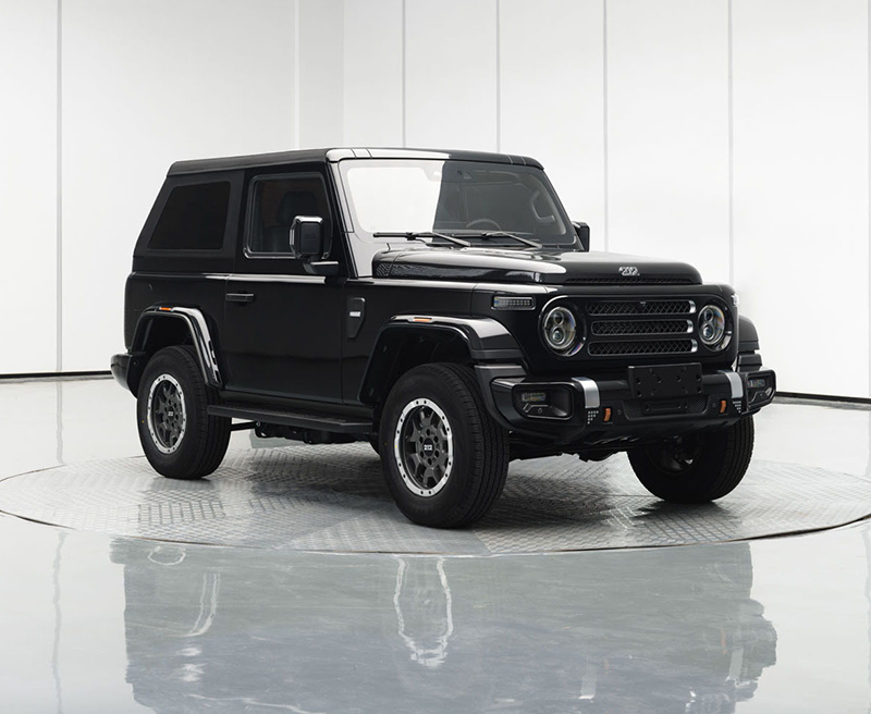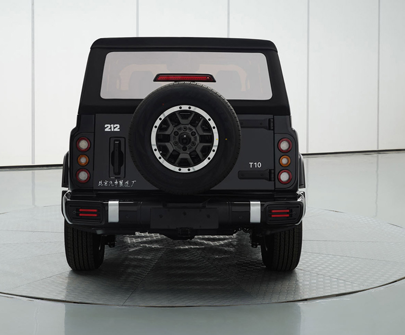 外观方面,新车延续了现款T01造型,前脸采用三条杠中网,搭配圆形大灯组,内部由两个圆形透镜组成的“8”字型车灯。另外新车采用两门设计,车顶还可拆卸。车身尺寸方面,新车长宽高分别为4416*1955*1925mm,轴距2570mm。车长轴距明显比T01更短,另外还提供拖车电源、绞盘等。