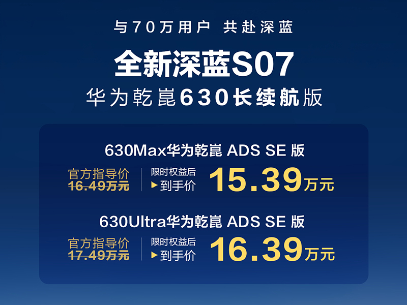 今日,深蓝S07华为乾崑630长续航版上市,共推出2款车型,售价区间为16.49-17.49万,限时权益价15.39-16.39万。