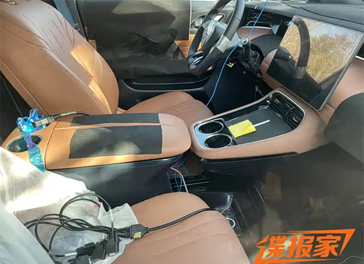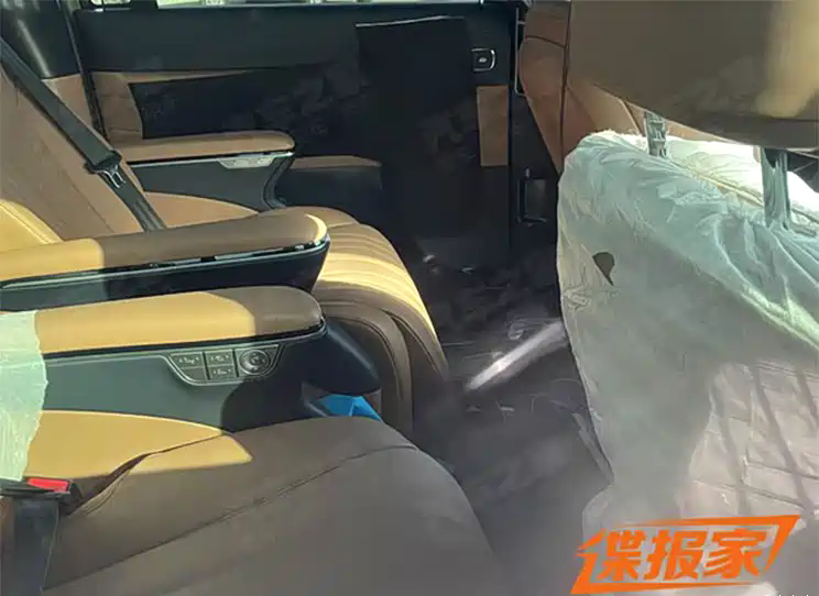 内饰方面,新车采用大尺寸中控屏搭配三辐式方向盘,车内简化实体按键。中央通道配备双手机无线充电及双杯架,未看到换挡机构,或为怀挡设计。二排独立座椅还在内侧配备多项调节功能。新车采用2+2+3的7座布局。