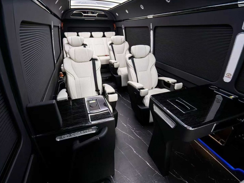 丰田考斯特改装内饰的设计上注重的是实用性和舒适性的完美结合。座椅的设计上也是十分的贴心,真皮航空座椅以及舒适的可旋转老板椅,或者是原装进口的埃尔法座椅,丰田考斯特改装商务车内饰的设计既能满足我们的需要也可以展示出内饰的高贵感。而丰田考斯特改装商务车同时设计了豪华的办公桌,我们的办公活动提供方便。