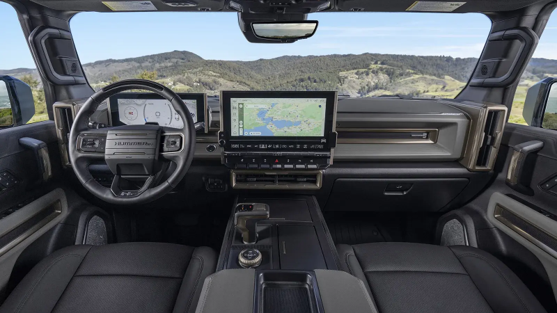 内饰方面,悍马EV的整体风格也是十分硬派,大量运用平直的线条来勾勒。但在功能性方面却一点也不落伍,配备了13.4英寸的中控屏和12.3英寸的数字仪表,可以显示扭矩输出、锁止差速器状态、俯仰和滚转角等诸多信息,另外还有18个摄像头组成的UltraVision全景影像系统,以及增强型Super Cruise超级智能驾驶辅助系统。