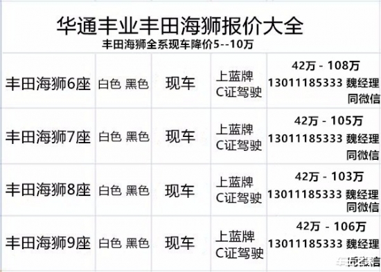 丰田海狮4s店电话13261183333 魏总 大客户经理丰田海狮6座7座8座9座合格证与座位相符全国上牌! 华通丰业丰田海狮(6座/7座/8座/9座10座/11座/12座/13座),9座以下丰田海狮可上蓝牌! 丰田海狮6座、华通丰业丰田海狮7座、丰田海狮8座、华通丰业丰田海狮9座丰田海狮10座版、丰田海狮11座版、丰田海狮12座版、丰田海狮13座版,更有可上蓝牌照的丰田海狮6座、丰田海狮7座、丰田海狮8座、丰田海狮9座,华通丰业大量现车价格优惠。