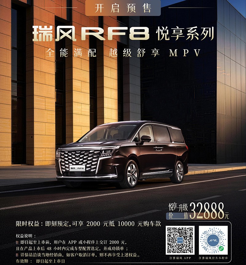 今日,江淮瑞风RF8悦享系列开启预售。新车定位中大型MPV。
