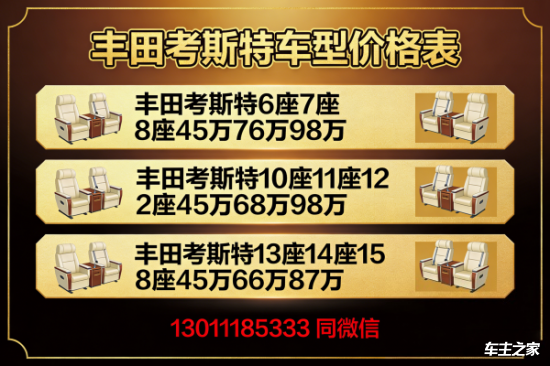 丰田考斯特 4s 店咨询热线;电话 13011185333,同微信,预约到店可享受价格优惠,免费领取丰田考斯特报价大全,快速提车。