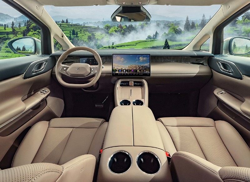 内饰方面,新车非常简约,大尺寸中控屏搭配内嵌式仪表,并提供双辐式方向盘。除此还提供无线充电、256色氛围灯,车内采用2+2+3七座布局,二排座椅还有腿托功能。另外新车还搭载元境智能辅助驾驶系统,可实现城市NOA及高速NOA全场景智能领航功能。