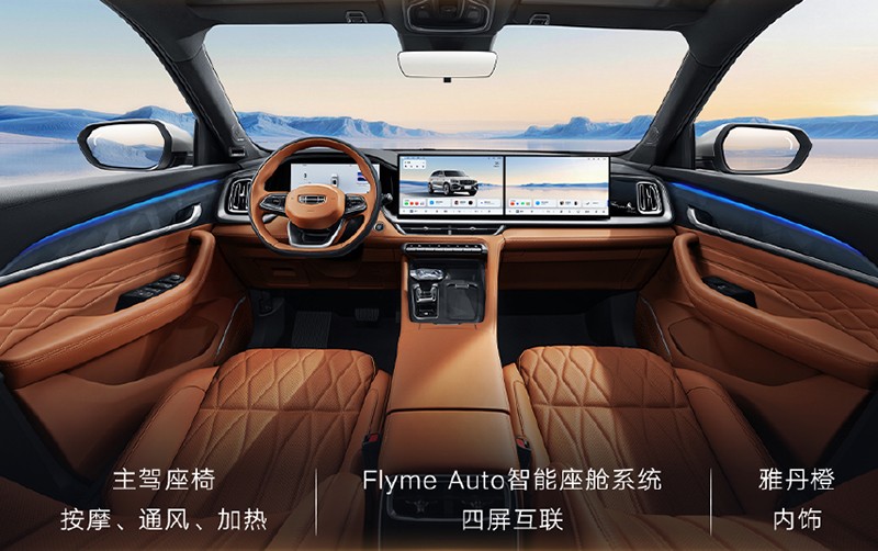 内饰方面,新车采用双14.6英寸中控屏+副驾娱乐屏组成的联屏设计,并提供12.3英寸仪表,内置Flyme Auto车机。新车支持HiCar、Carlink及Flymelink,还将搭载千里浩瀚H3辅助驾驶方案,支持HNOA高速领航辅助。