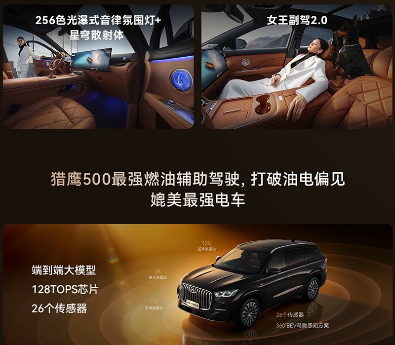 内饰方面,新车中控屏+副驾屏组成30英寸一体屏,搭配双辐式方向盘,标配高通骁龙8255芯片。新车还将提供女王副驾。新车将搭载猎鹰500辅助驾驶,支持高速NOA、遥控泊车等。