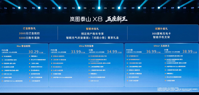 4月22日,岚图泰山X8开启预售,共推出5款车型,预售价30.29-38.99万。新车定位全新大五座SUV,将亮相北京车展。