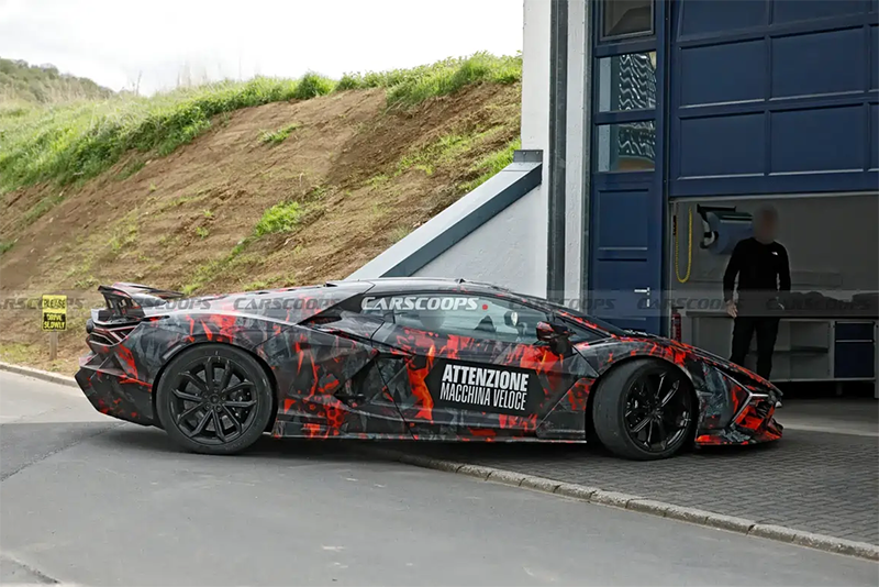 从谍照细节来看,Revuelto SV在外观上进行了针对性空气动力学升级:前脸配备专属保险杠与夸张前分流器,进气口改为三角形设计,前轮后方新增侧装鳍片;车尾加装大尺寸后扰流板,尾灯上方新增通风口,排气系统改为六边形包围搭配圆形尾喉,扩散器暂延续标准版设计,量产版或有调整。此外,新车预计将搭载SV专属轻量化轮圈。